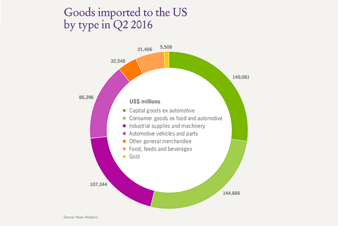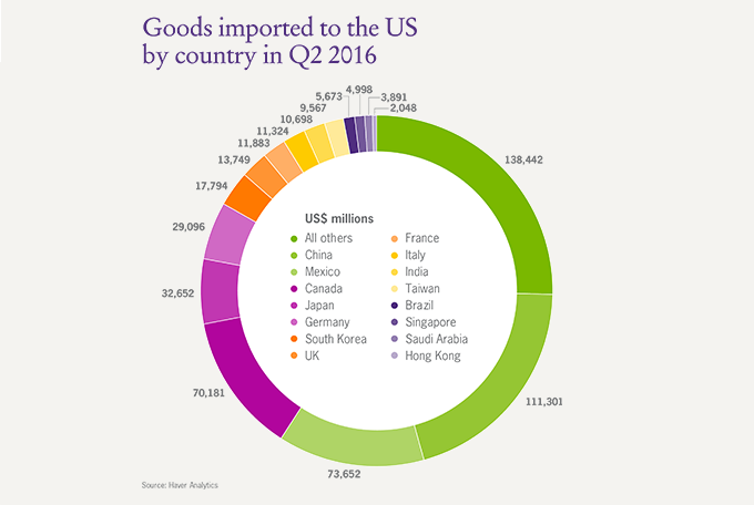 • The US is the world’s largest national economy with imports from all across the world; the following charts show, in US$ millions, those countries which benefit most from access to the US market and are therefore most exposed to related economic fluctuations: