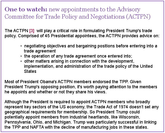 If the US seeks bilateral trade agreements with each of these countries, it'll be interesting to see how non-tariff barriers (NTBs) are addressed.[1] One of the reasons why the TPP has been described as a state-of-the-art agreement is because it was designed primarily to eliminate NTBs. The Trump-administration could potentially eliminate various US NTBs, but continue to maintain traditional tariff barriers in order to protect certain US industries.